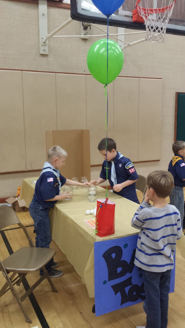 In the Bear den they have to put on a carnival for other scouts, so for January pack meeting the Bears did a fun little carnival. They came up with the games and ran their stations pretty much by themselves. It was so cute to see them running their stations. Noah and his friend, Evan, did a ball toss game.